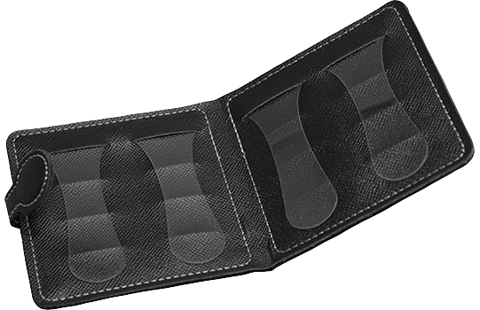 ギター・ピック専用の二つ折り革製ウォレットです。ピックを収めるスロットが12個あります。ピックの大きさや厚さにもよるでしょうが、1スロットに2〜3枚程度までなら収納できます。透明なプラスチック製のホルダーで、ピックが落ちないようにガードします。閉じるとマグネットの蓋がぴったりとくっつくので、ピックをバラけさせずに持ち運びできます。ちょっとしたプレゼントにもピッタリです。
